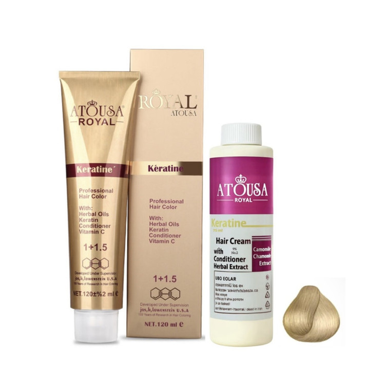رنگ مو آتوسا رویال شماره 12.3_M11 حجم 120 میلی لیتر رنگ بلوند زیتونی فوق العاده روشن به همراه اکسیدان آتوسا رویال مدل 2 نه درصدی حجم 75 میلی لیتر